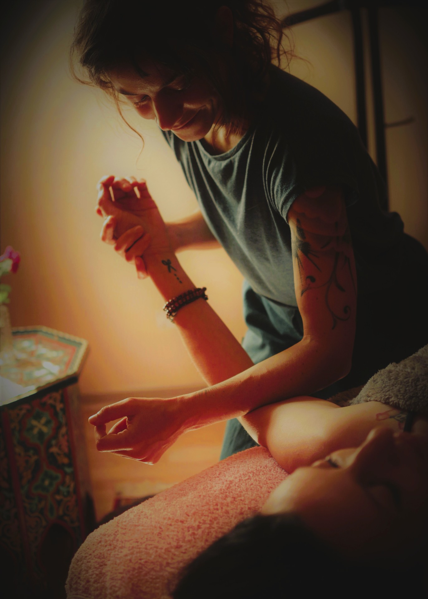 Formée en massage bien-être et en ostéopathie, j'utilise des techniques issues de protocoles ayurvédique, lomi-lomi, relaxation musculaire, drainage lymphatique, combinées à des techniques d'harmonisation énergétique, d'écoute tissulaire, de libération somato-émotionnelle.